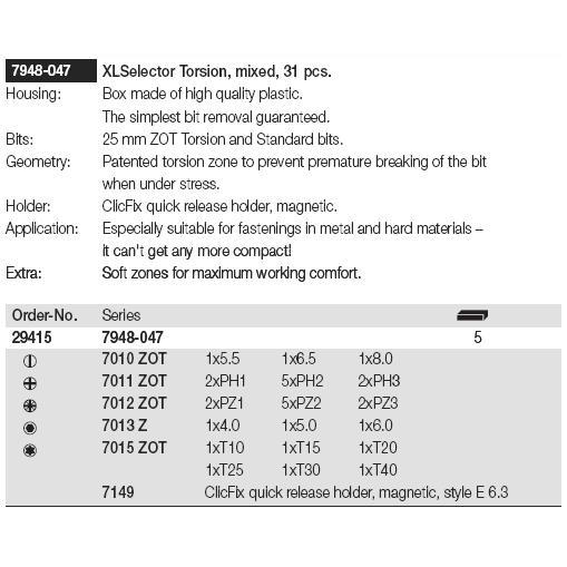 Hộp mũi bits chuyên dùng Mã số 7948-047 là sự lựa chọn lý tưởng cho những người làm việc chuyên nghiệp hoặc người tự sửa chữa tại nhà. Với các loại mũi tô vít 2 cạnh, mũi tô vít 4 cạnh, mũi Pozi, mũi lục giác, và mũi hoa thị, bạn có đủ công cụ để xử lý nhiều tình huống khác nhau.