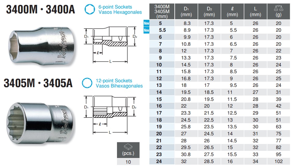 - Loại cạnh: 6 cạnh (3400M), 12 cạnh (3405M)