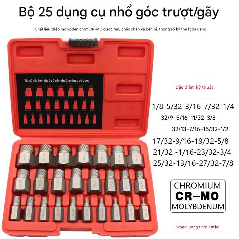Bộ khẩu tháo bulông gãy ốc hỏng 25 chi tiết là một bộ dụng cụ chuyên nghiệp giúp bạn giải quyết vấn đề với các loại bulông, ốc bị gãy, hỏng, khó tháo do bất kỳ nguyên nhân nào. Dưới đây là chi tiết về bộ dụng cụ này: