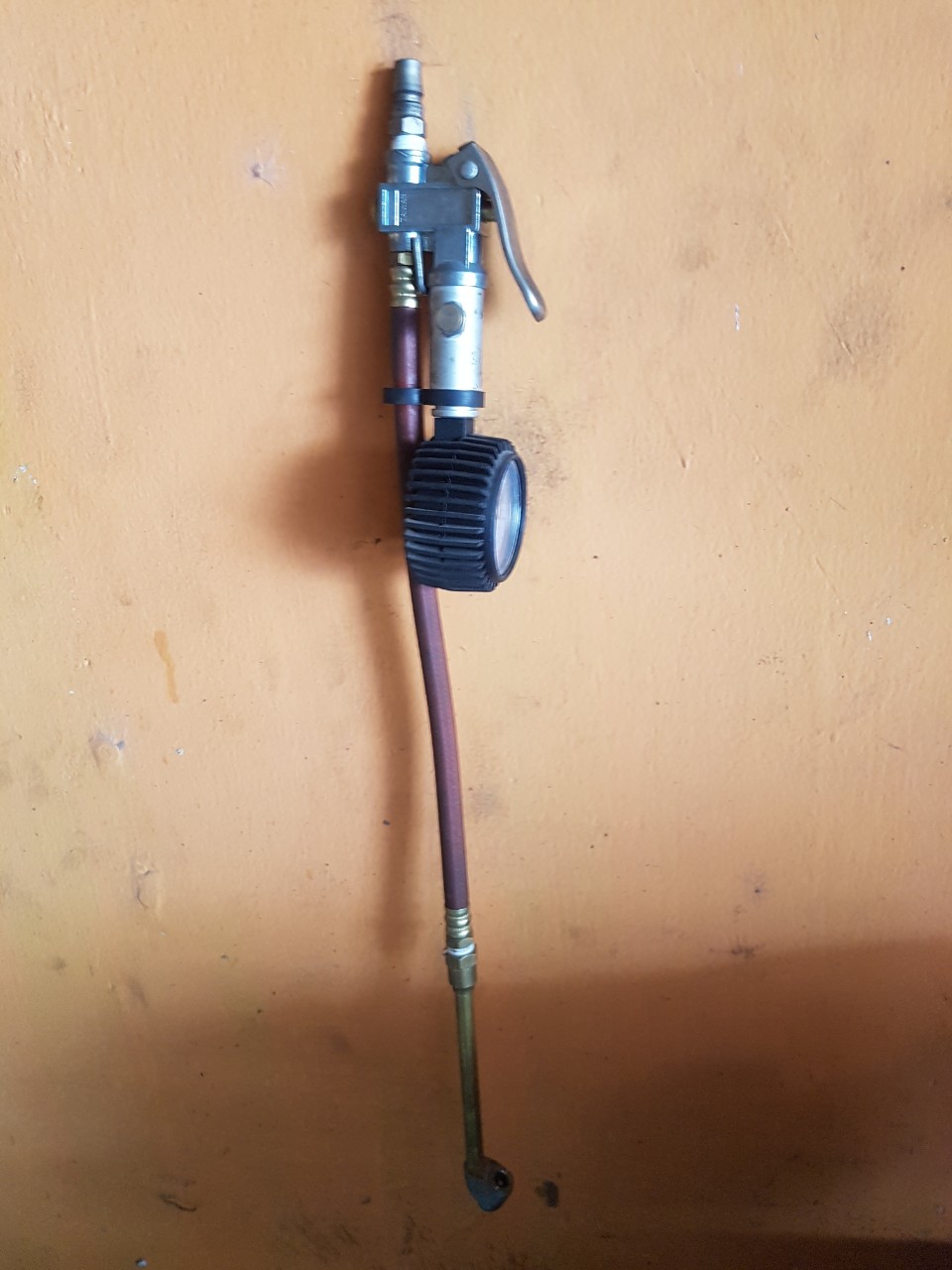 - Đặt súng bơm hơi có đồng hồ lên van và bóp tay cầm để bơm.