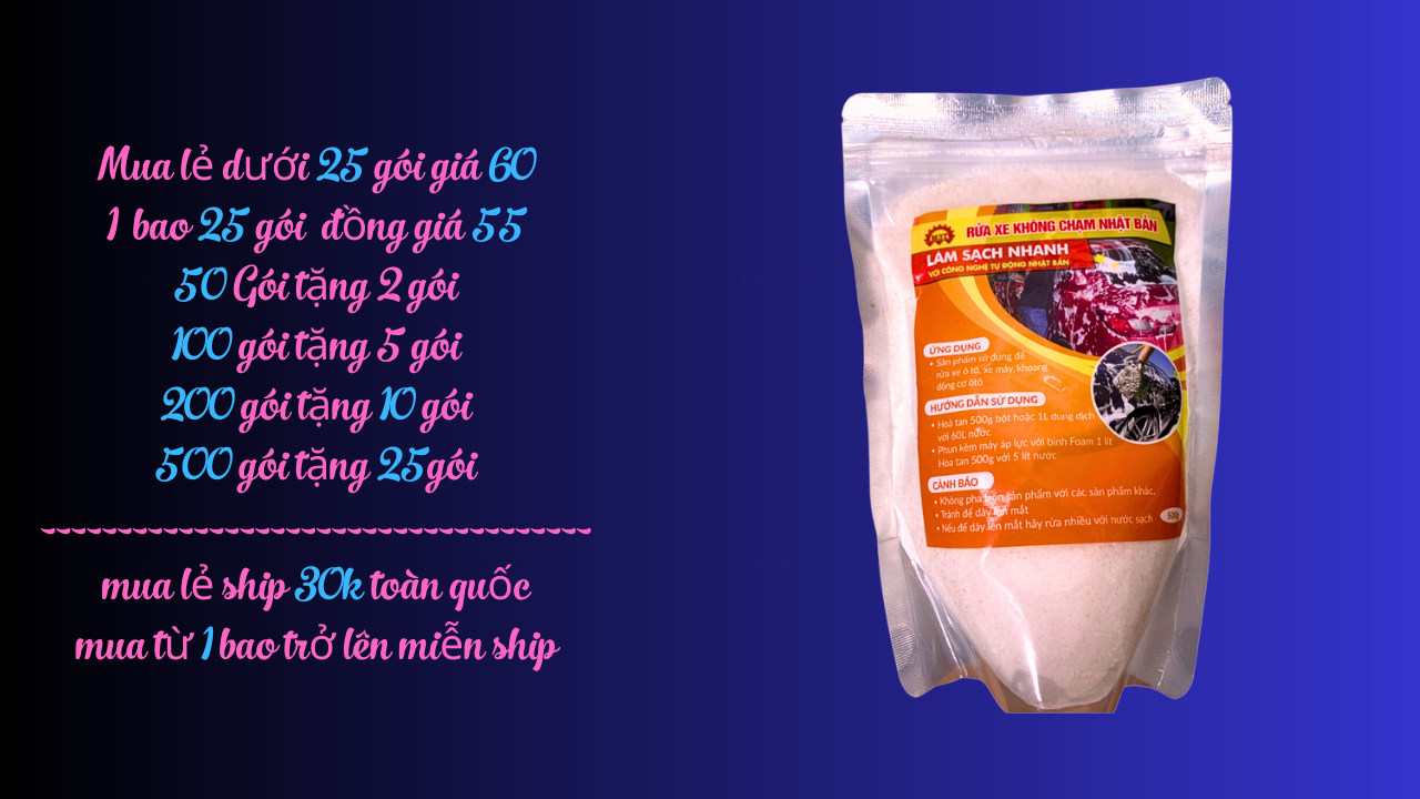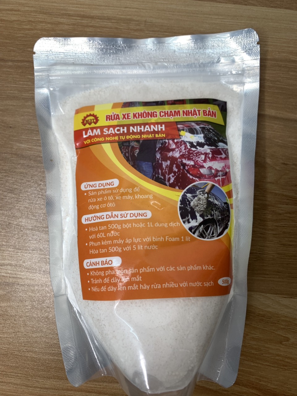 Bột rửa xe không chạm là một loại hóa chất được pha chế dưới dạng bột, có tác dụng loại bỏ bụi bẩn, dầu mỡ, các vết bẩn khó nhìn thấy trên bề mặt xe một cách nhanh chóng và hiệu quả. Sản phẩm này được sản xuất tại Nhật Bản, nơi nổi tiếng với chất lượng sản phẩm đảm bảo và sự tiên tiến trong công nghệ sản xuất.