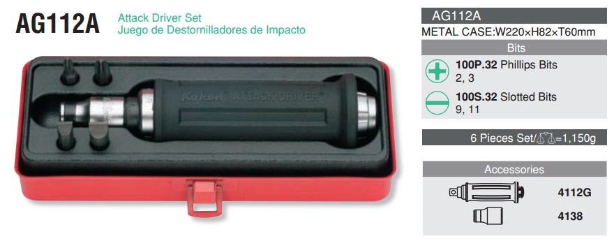 Bộ tô vít đóng Koken AG112A sử dụng cán đóng 4112G và đầu nối 4138. Đây là một sự kết hợp hoàn hảo giữa chất lượng và hiệu suất.