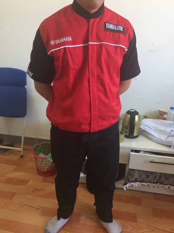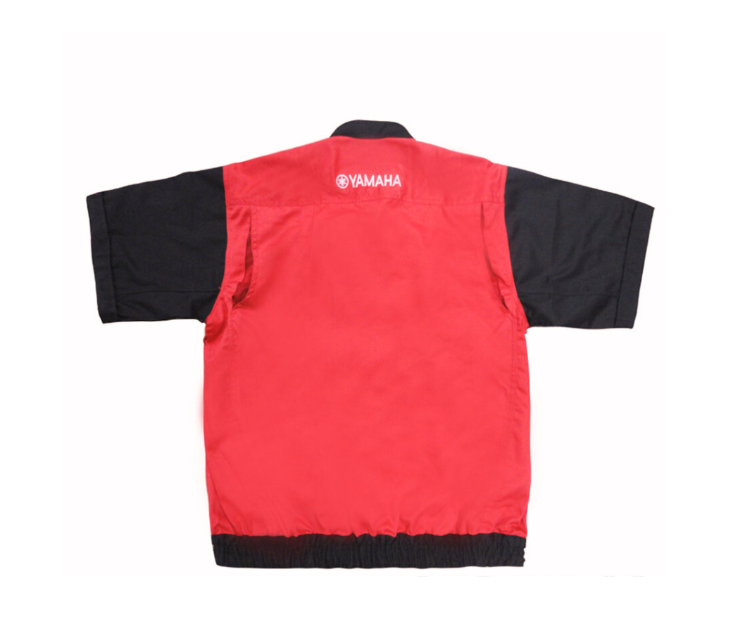 Màu sắc và logo: Bộ đồng phục có phối màu đỏ và đen, tạo nên sự nổi bật và chuyên nghiệp. Logo của Yamaha được thêu màu trắng trên áo, làm nổi bật thương hiệu và tạo điểm nhấn cho bộ đồng phục.