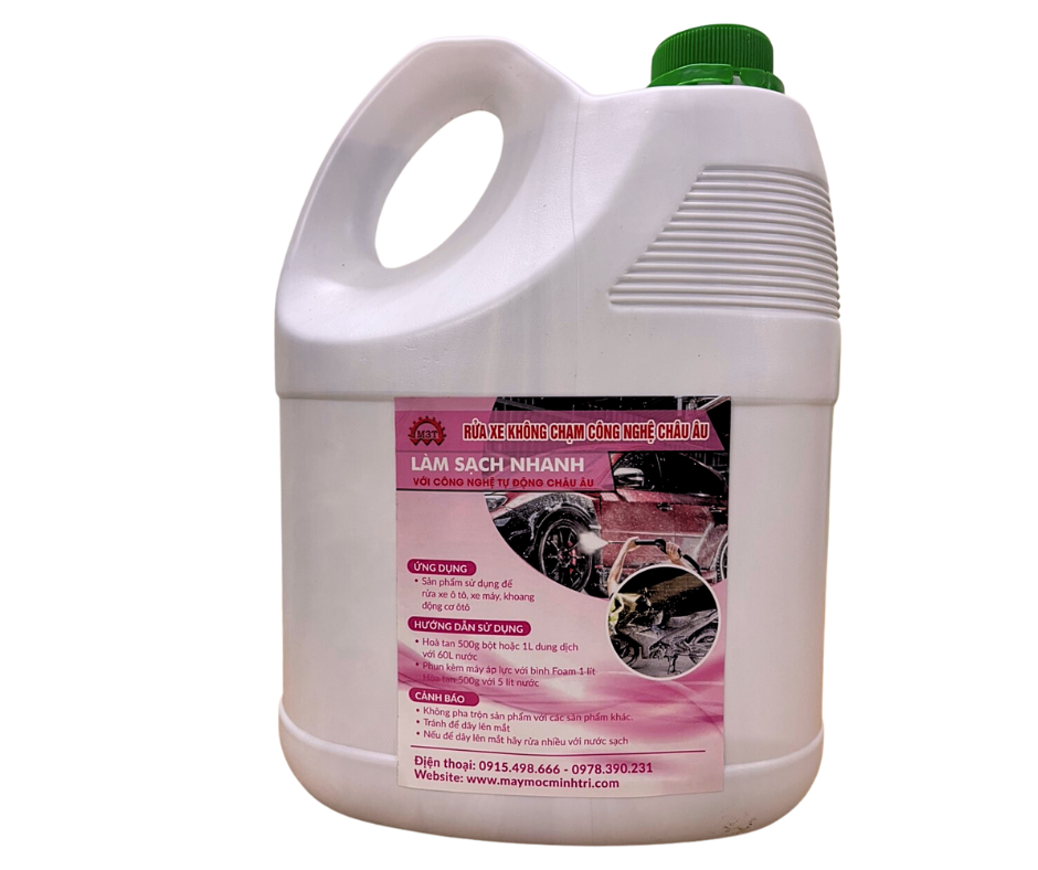 Dung dịch rửa xe không chạm công nghệ Châu Âu được phân phối bởi máy móc Minh Trí với dung tích 4 lít là một sản phẩm chất lượng cao, đạt tiêu chuẩn chất lượng của Châu Âu. Sản phẩm này được thiết kế dạng bọt siêu tập trung, giúp loại bỏ mọi bụi bẩn, dầu mỡ và bám trên bề mặt xe một cách nhanh chóng và hiệu quả.