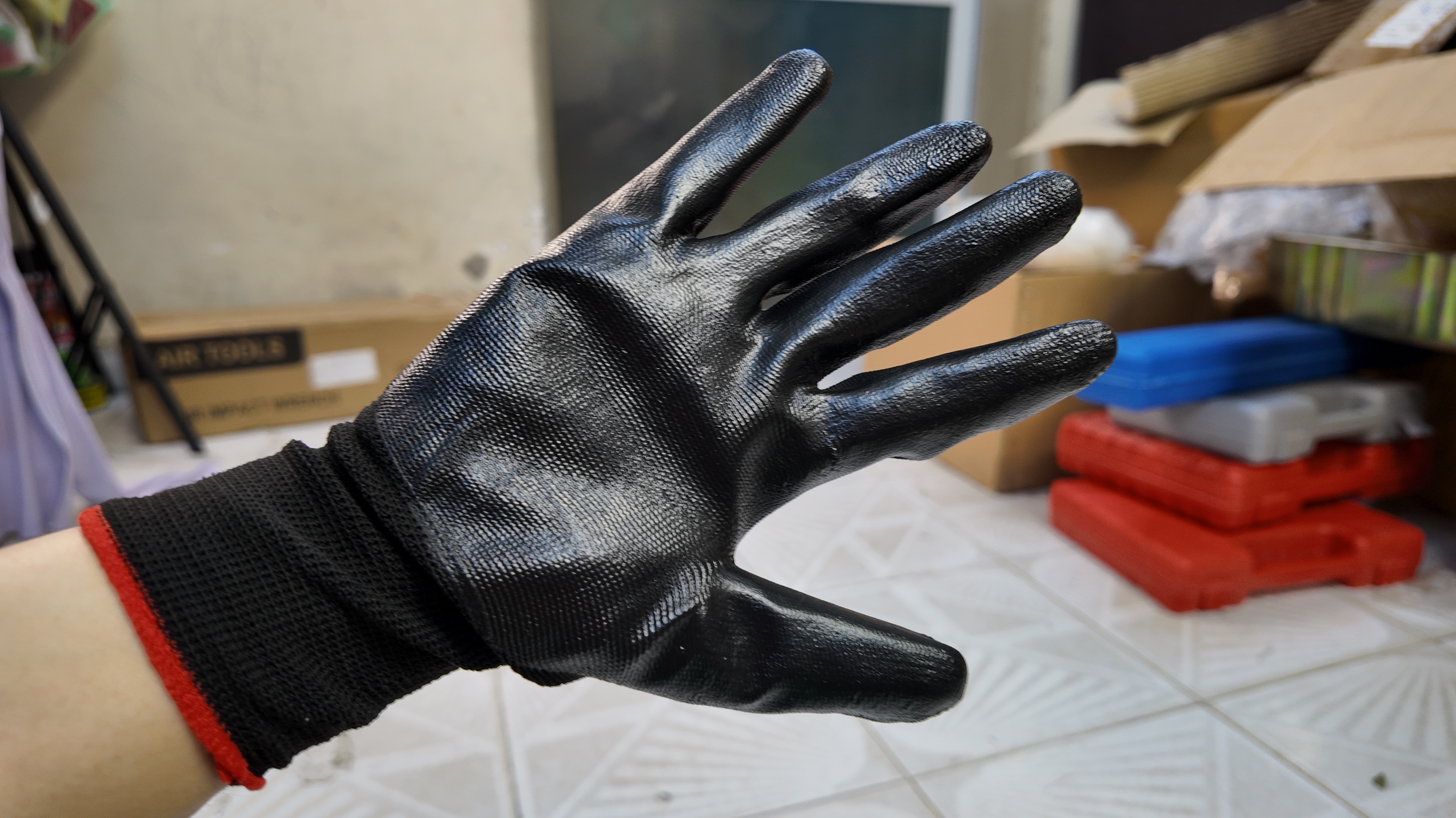 Lòng bàn tay của găng tay được phủ một lớp Nitrile dày 0,9mm, cung cấp độ bám tuyệt vời ngay cả trong môi trường trơn trượt và ẩm ướt. Nitrile là một chất liệu không gây dị ứng, an toàn cho cả những người có làn da nhạy cảm. Nó còn nổi trội với khả năng chống dầu, giúp găng tay không bị ảnh hưởng bởi dầu mỡ, từ đó kéo dài tuổi thọ sử dụng.