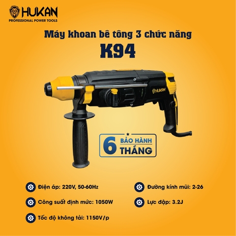 Khoan bê tông 3 chức năng K94 thương hiệu HUKAN là một sản phẩm đa năng và mạnh mẽ, được phân phối bởi cửa hàng Máy móc Minh Trí. Dưới đây là một số thông số kỹ thuật chính của sản phẩm: