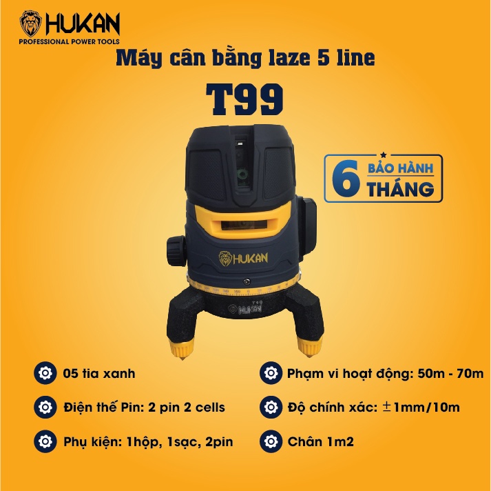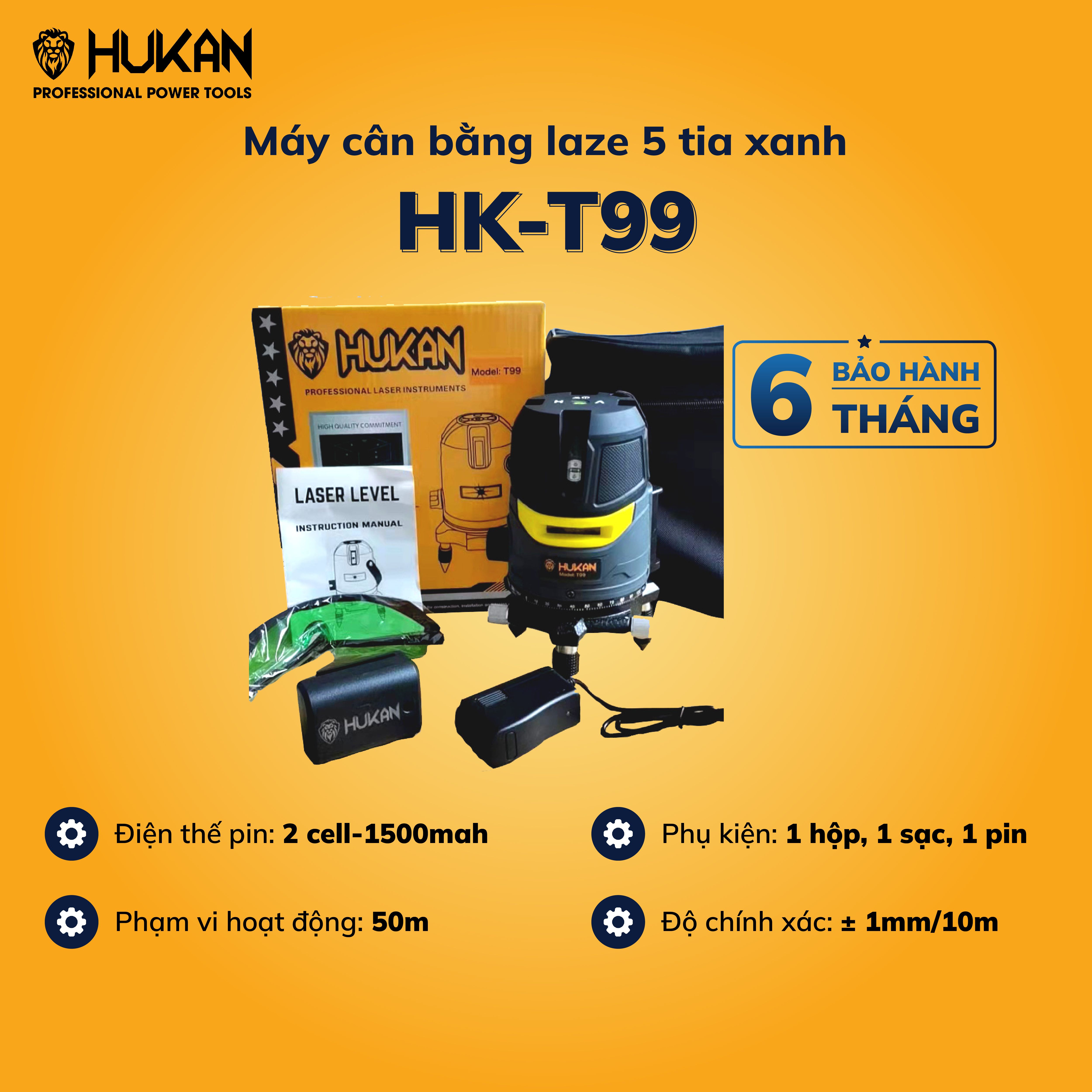 Máy cân bằng laze, máy bắn cốt 5 tia xanh HUKAN HK-T99 là một thiết bị chủ yếu được sử dụng trong các công việc xây dựng, thi công và trang trí nội thất. Dưới đây là thông số kỹ thuật và các chức năng, ứng dụng của máy: