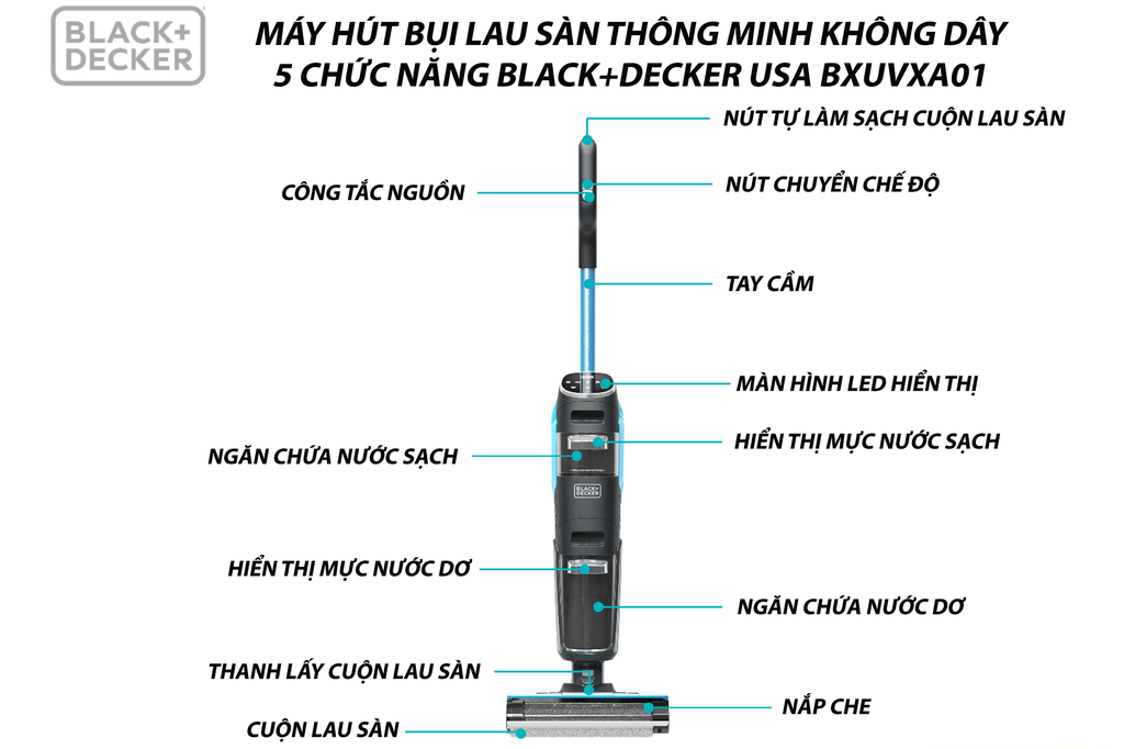 Máy hút bụi lau sàn thông minh không dây 5 chức năng Black+Decker BXUVXA04 không chỉ là một công cụ làm sạch, mà là một người bạn đồng hành thông minh, mang lại sự thuận tiện và hiệu quả trong mọi công việc làm sạch ngôi nhà của bạn.