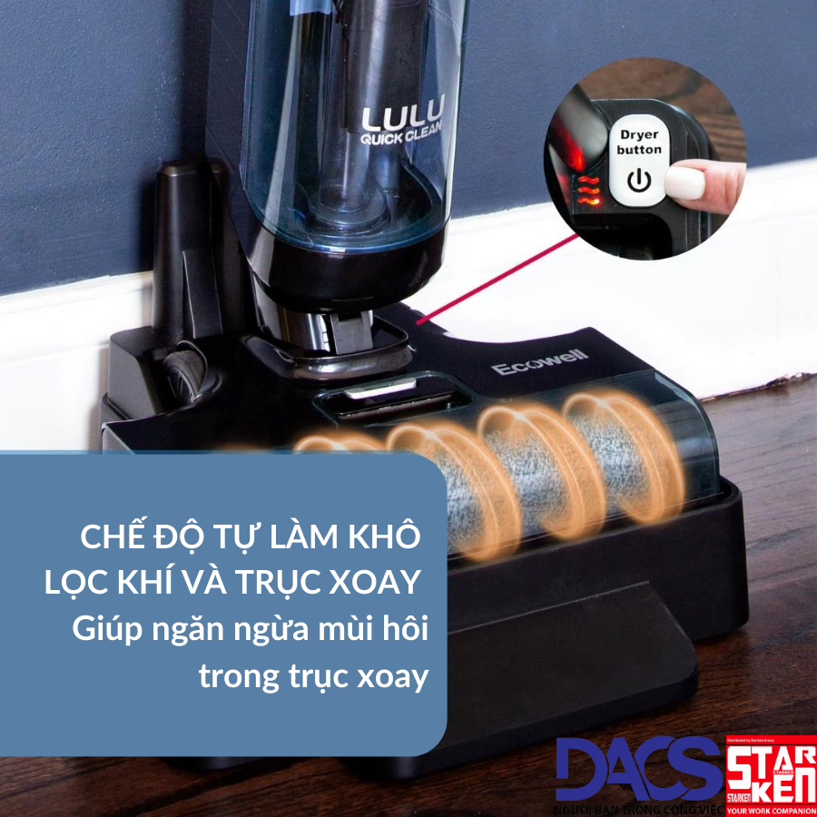 Chế Độ Làm Khô Lọc Bụi: Máy có chế độ tự động làm khô lọc bụi và trục xoay lau sàn, giúp khử bỏ mùi hôi đọng lại trong quá trình sử dụng.