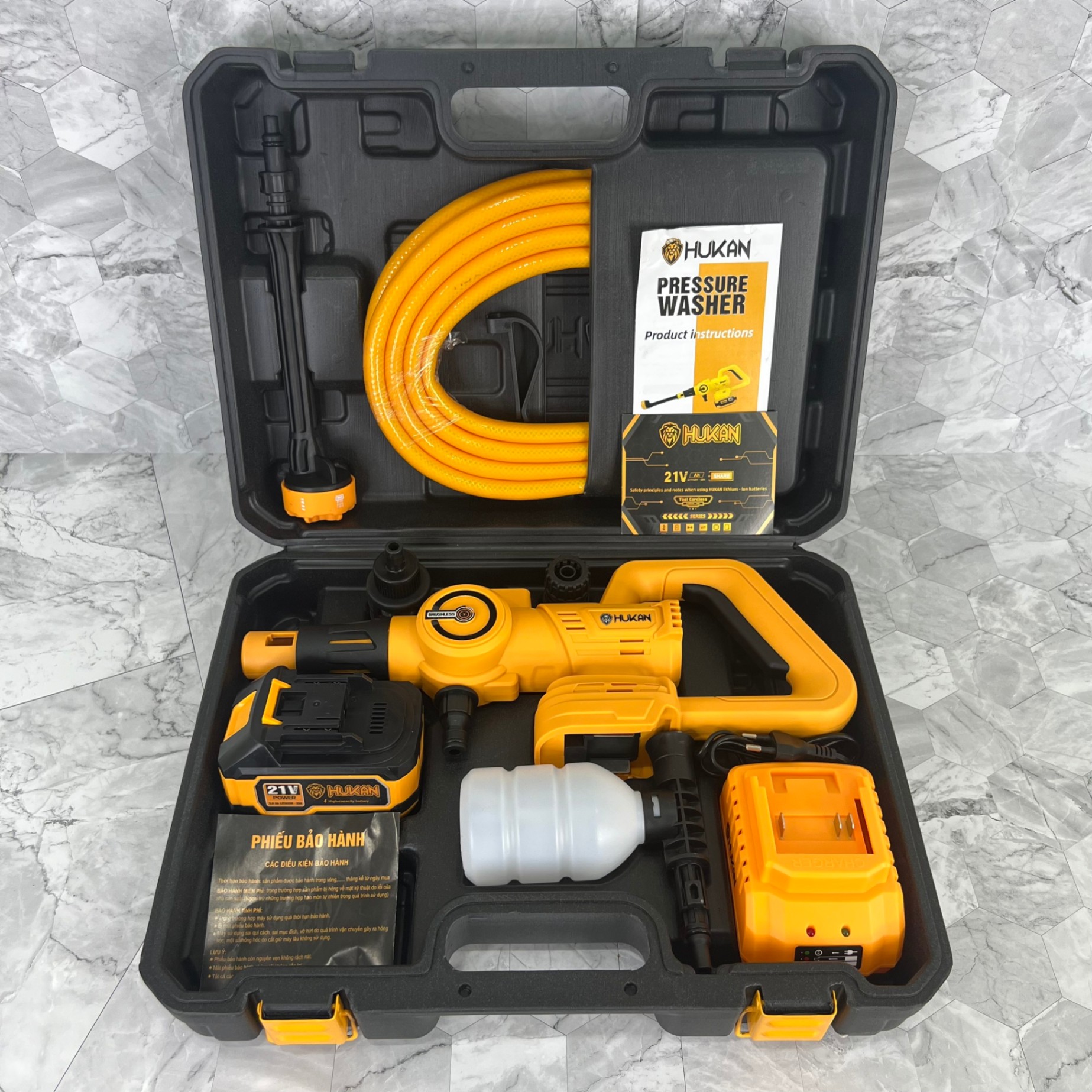 Tóm lại, máy rửa xe chạy pin HK-PW3828BL là một lựa chọn tuyệt vời cho việc làm sạch và rửa xe. Với tính di động, hiệu suất cao, và tính năng tiết kiệm nước, máy rửa xe này không chỉ giúp bạn tiết kiệm thời gian và công sức mà còn mang lại sự tiện lợi và hiệu quả trong công việc chăm sóc xe hơi của bạn.