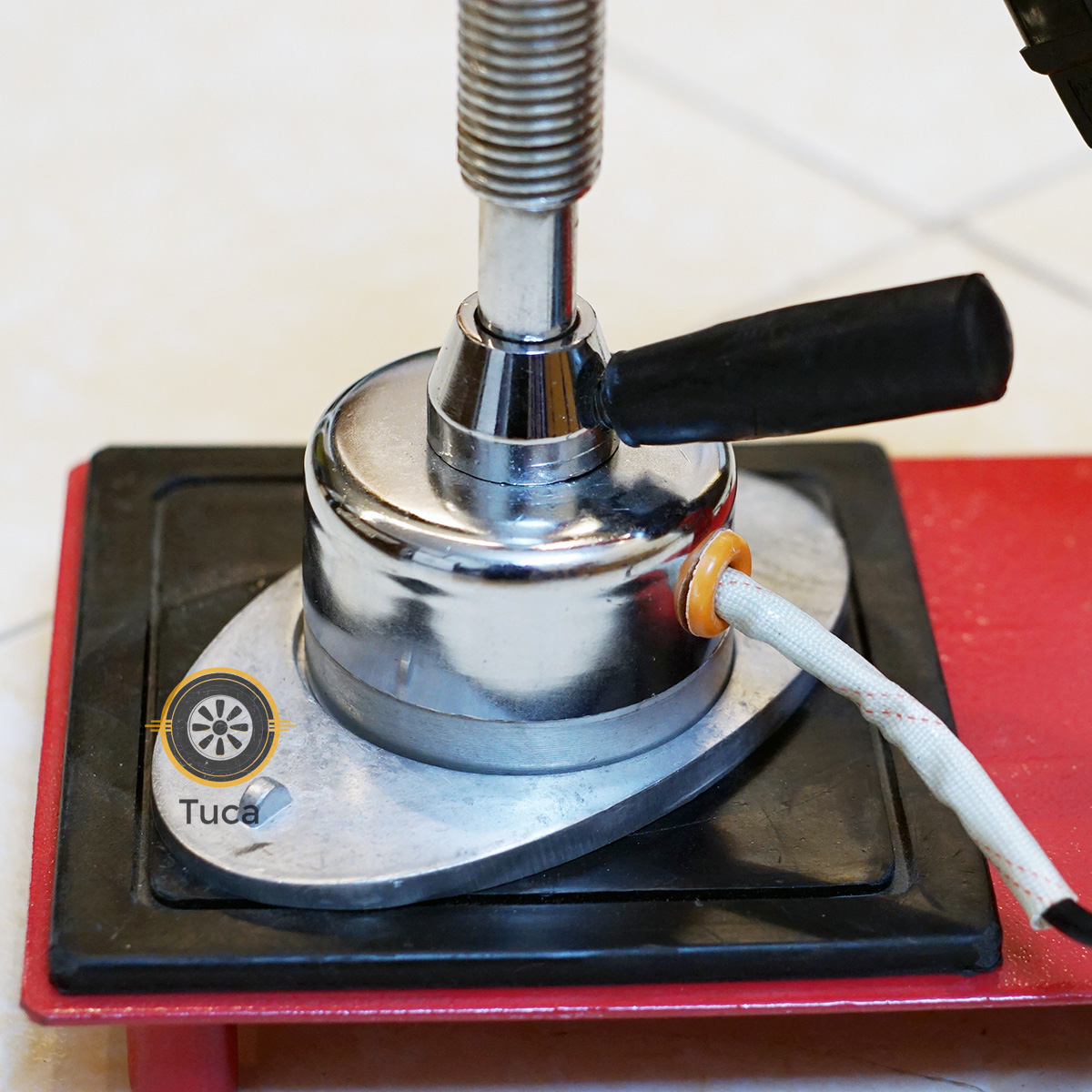 Bước 4: Đặt cục gia nhiệt của máy vá chín lên vị trí miếng vá. Điều chỉnh trục máy vá chín lốp sao cho đầu trục đặt trên cối lõi của cục gia nhiệt theo hướng thẳng đứng. Vặn trục xuống để cố định cục gia nhiệt, sau đó sử dụng súng bắn siết để chặt trục và ép chặt miếng vá xuống lốp.