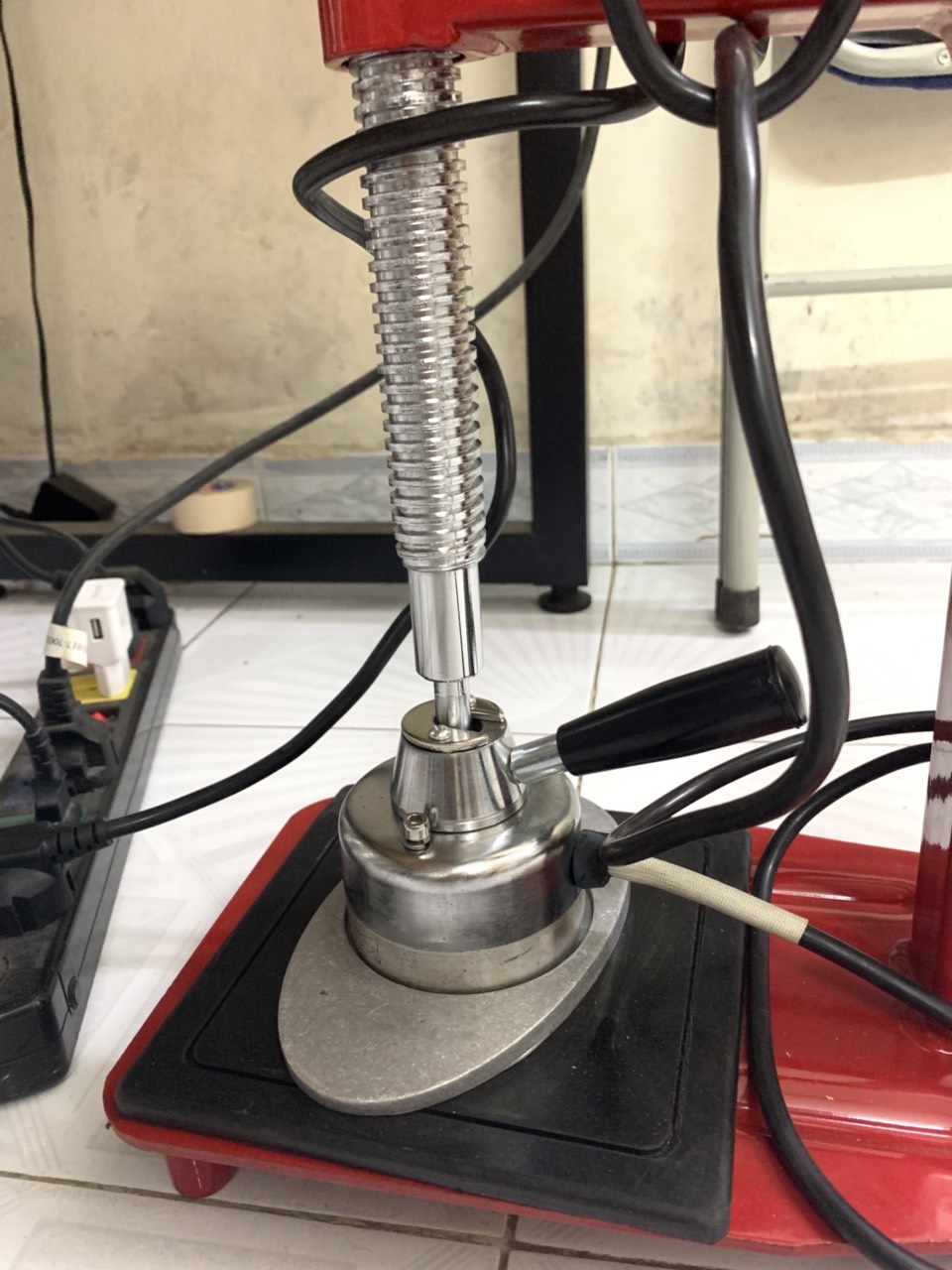- Trụ ép: Là một đai ốc kích thước lớn đặt xuyên qua đầu trên thân máy, trụ ép có thể điều chỉnh độ cao thấp bằng tay vặn.