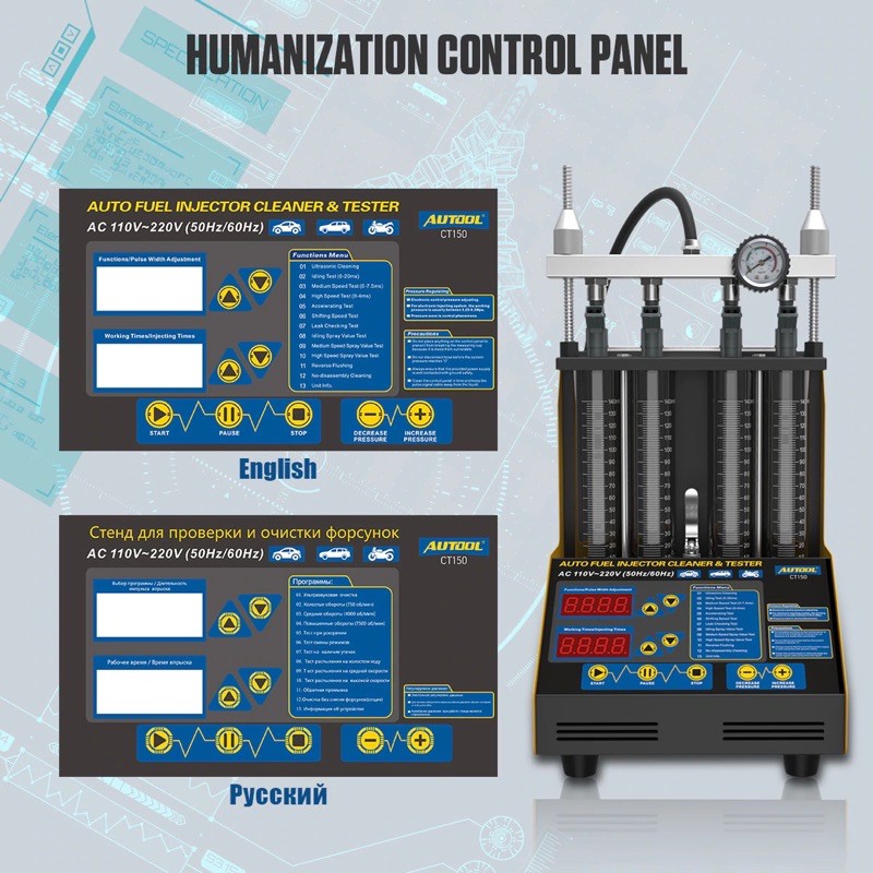 AUTOOL CT150 là một thiết bị chuyên nghiệp với 4 ngăn tự động để làm sạch và thử nghiệm hệ thống phun nhiên liệu trên các loại xe ô tô và xe máy.