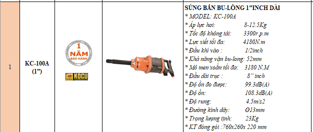 Súng bắn bu lông 1 inch dài KoCu KC-100A là một sản phẩm với nhiều ưu điểm và tính năng đáng chú ý. Dưới đây là thông số kỹ thuật chi tiết của sản phẩm và cách khắc phục một số sự cố phổ biến: