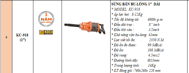 Hiệu suất vượt trội: Với áp lực hơi từ 8-12Kg/cm2 và tốc độ không tải lên đến 4000 r.p.m, súng KC-918 cung cấp khả năng siết chặt mạnh mẽ và nhanh chóng, giúp tiết kiệm thời gian và năng lượng.