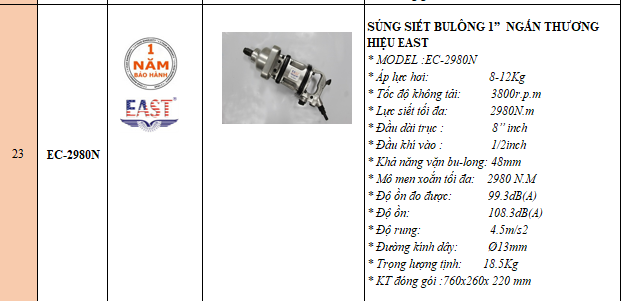 Súng siết bu-lông 1" ngắn thương hiệu East, model EC-2980N, là một lựa chọn xuất sắc cho các tác vụ siết chặt bu-lông trong công việc cơ khí, xây dựng, ô tô và nhiều ngành công nghiệp khác. Với tính năng và thông số kỹ thuật ấn tượng, sản phẩm này mang lại hiệu suất vượt trội và tiện ích cho người sử dụng. Dưới đây là một số điểm nổi bật của súng siết bu-lông EC-2980N: