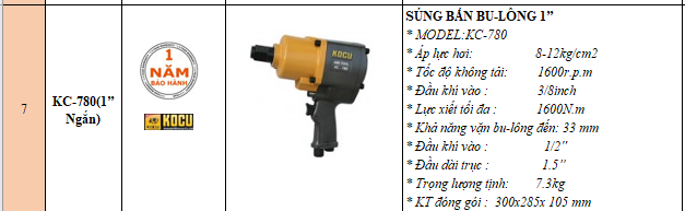Thông số kỹ thuật súng bắn bu lông hơi 1 inch KC780:
