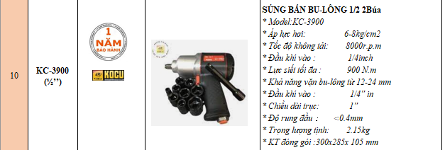 Hiệu suất vượt trội: Với áp lực hơi 6-8kg và tốc độ không tải lên đến 7000r.p.m, súng bắn bu-lông Koku KC-3900 có khả năng thực hiện công việc mạnh mẽ và nhanh chóng, giúp tiết kiệm thời gian và năng lượng.