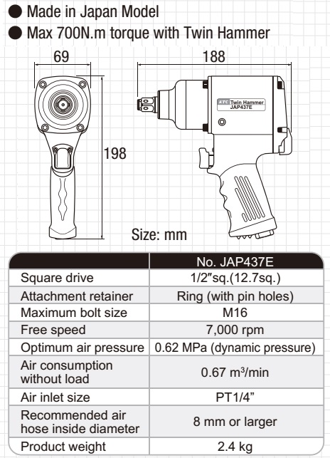 Súng vặn bu lông KTC JAP437E có các thông số kỹ thuật ấn tượng. Với chiều dài 188mm và trọng lượng 2.4kg, sản phẩm này mang lại sự thoải mái và dễ sử dụng cho người dùng. Điều này giúp tăng khả năng làm việc trong các môi trường khó khăn và giảm mệt mỏi trong quá trình sử dụng.
