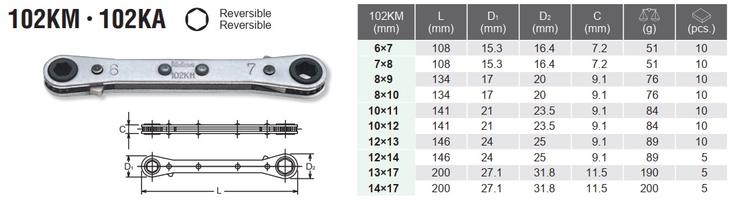 Đa dạng cỡ: Với nhiều lựa chọn cỡ từ 6x7 đến 14x17, tay vặn 102KM đáp ứng đa dạng nhu cầu của người sử dụng.