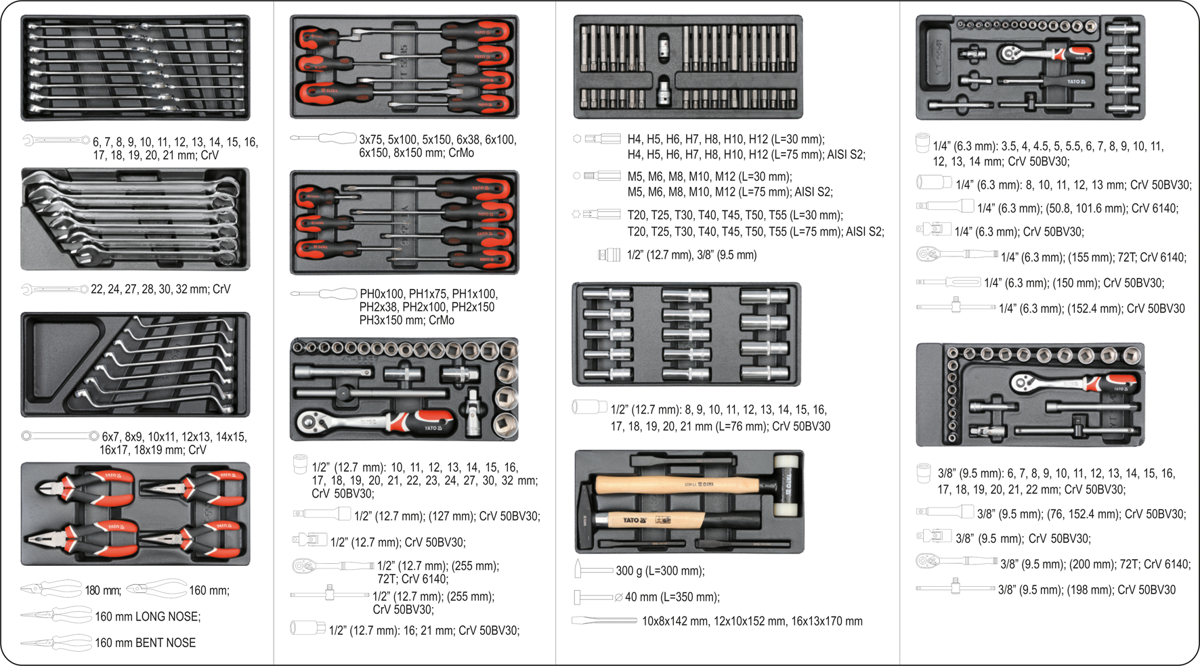 Chất Lượng Vượt Trội: Sản phẩm Yato luôn nổi tiếng với chất lượng sản phẩm cao cấp, và YT-55300 không phải là ngoại lệ. Các công cụ được làm từ thép sơn tĩnh điện chất lượng cao, giúp chúng chống ăn mòn và va đập, đảm bảo sự bền bỉ trong thời gian dài.