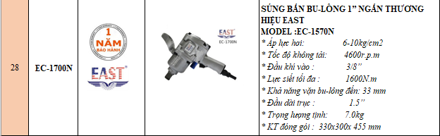 Với sự linh hoạt, hiệu quả và tính năng đáng tin cậy của súng bắn bu lông 3/4 inch ngắn East EC-1700N, bạn có thể hoàn thành các tác vụ cơ khí một cách dễ dàng và chính xác hơn bao giờ hết. Đây là một công cụ không thể thiếu trong ngành công nghiệp và sửa chữa.