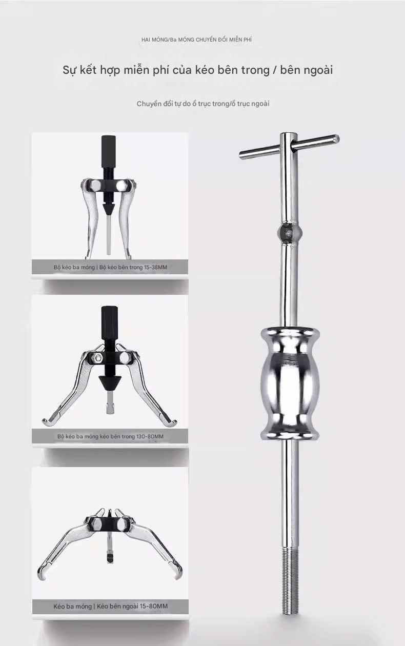 Sản phẩm này nổi bật với thiết kế thông minh, dễ dàng chuyển đổi giữa các tùy chọn kéo trong và kéo ngoài, giúp người dùng thao tác linh hoạt trong các tình huống khác nhau. Đặc Điểm Nổi Bật Thiết Kế Hai Tùy Chọn Kéo Trong/Ngoài: Búa kéo ba móng vuốt cho phép chuyển đổi giữa hai chế độ kéo trong và kéo ngoài, tùy thuộc vào yêu cầu của công việc. Kích thước kéo trong: 15-38mm và 30-80mm, phù hợp cho các trục có đường kính khác nhau. Kích thước kéo ngoài: 15-80mm, đáp ứng được nhiều loại vòng bi và bánh răng khác nhau.