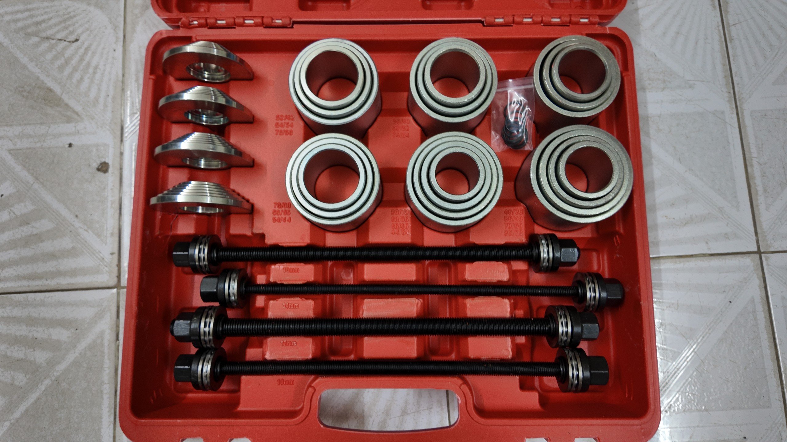 - Đa Năng và Linh Hoạt: Với các kích thước ống lót khác nhau, bộ dụng cụ có thể được sử dụng trong nhiều loại công việc khác nhau, từ tháo lắp bạc đạn đến bảo trì các phần tử cao su.
